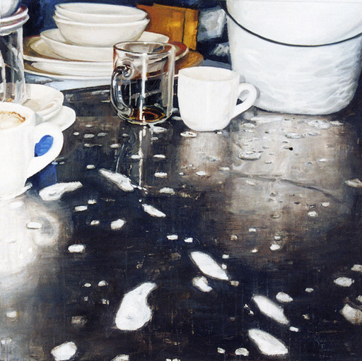 •1999/2000 De serie 'Americana' ontstond bijvoorbeeld naar aanleiding van de opdracht om 5 stillevens te schilderen. In 1999 maakte ik een studie reis door Amerika en schilderde naar aanleiding van dat reizende leven het afval op de tafels van de diners.
